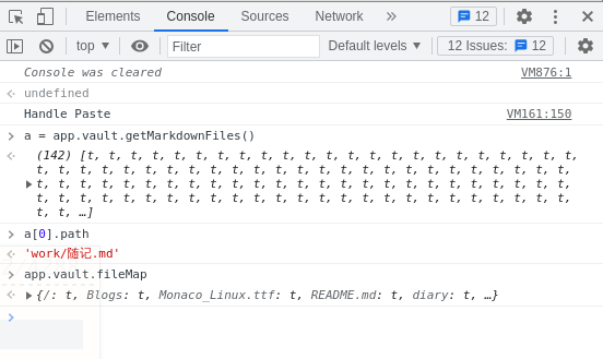 在obsidian中按Ctrl+Shift+I呼出调试窗口,在console页签中可以直接获取到obsidian.d.ts中的API。
