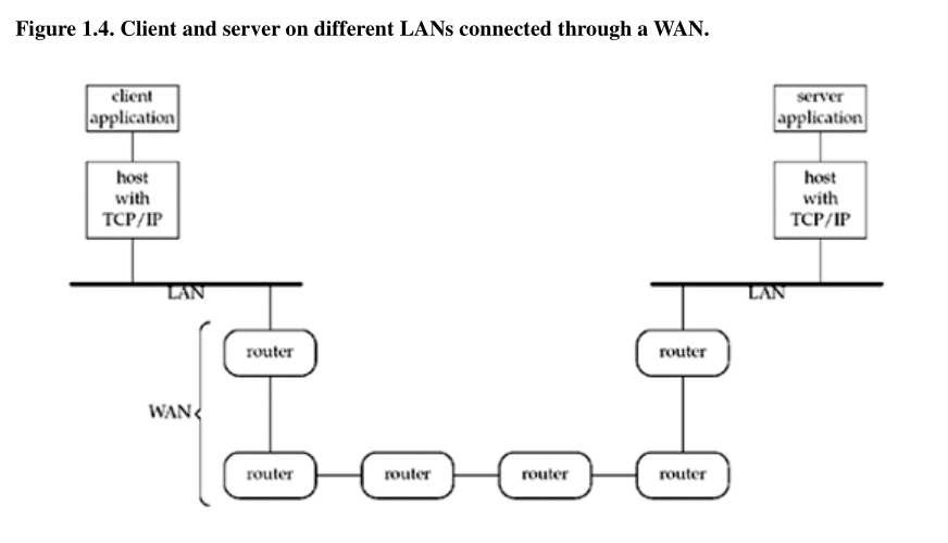 网络结构图: The client and server need not be attached to the same local area network (LAN), we show the client and server on different LANs, with both LANs connected to a wide area network (WAN) using routers.