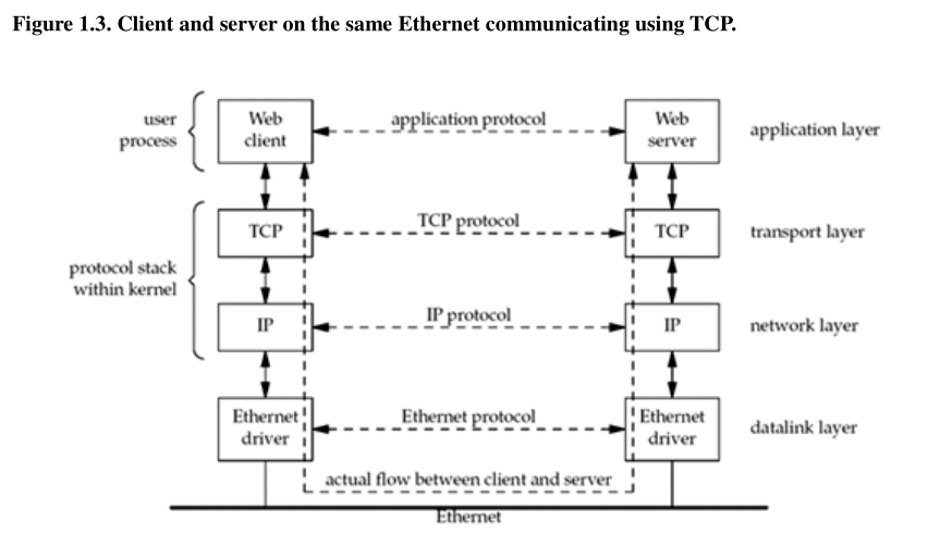 - the actual flow of information between the client and server goes down the protocol stack on one side, across the network, and up the protocol stack on the other side;